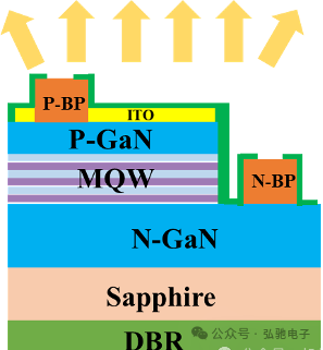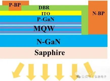 (1)正装结构LED的p、n电极在LED的同一侧,电流需横向流过n-GaN层,导致电流发生拥挤,局部产生大量热,限制了驱动电流;(2)蓝宝石衬底的导热性差,严重阻碍了热量的散失;(3)温度和湿度等因素可能导致电极金属迁移,随着芯片尺寸缩小,正负电极间距减小,可能会有短路的问题出现。正装芯片有多种分类方式,可以按照发光颜色、芯片功率、应用范围等进行分类。为更好的阐述正装LED芯片的结构。本文根据芯片功率将芯片分为小功率芯片、中功率芯片、大功率芯片三类。小功率芯片的结构相对简单,制作工艺也相对简单,通常采用三次光刻制程,分别是MESA光刻、ITO光刻、PAD光刻,详细流程如下:中功率芯片通常会采用5次光刻制程,在小功率的3次光刻工艺的基础上增加了电流阻挡层(CBL)光刻、钝化(PV)光刻,具体工艺流程如下:也可以采用先ITO后MESA的工艺流程,这有利于芯片良率的提升,详细流程如下:中功率芯片在研磨后通常会背镀上高发射率的DBR。DBR可以显著提高芯片点测亮度,对封装后的亮度也有一定的提升。大功率芯片通常也是采用中功率的5次光刻制程,但是背镀层会由原来的DBR改为ODR(全方位反射层)。蓝宝石衬底的正装结构LED以工艺简单、成本相对较低,一直是GaN基LED的主流结构。目前,多数企业为节约生产与研发成本,仍采用这种结构。
