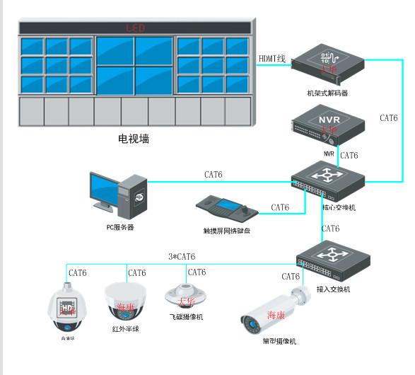 表现城是我们最直观感受到的,它展现了整个安防监控系统的品质。如监控电视墙、监视器、高音报警喇叭、报警自动驳接电话等等都属于这一层。