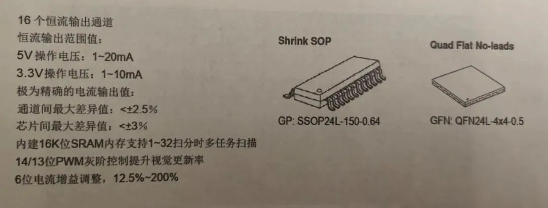 (2)、LED屏恒流驱动芯片电流存在差异,LED 显示屏的灯珠都是由恒流驱动芯片驱动的,典型的恒流驱动芯片有 16 个通道。下图所示为某型号恒流驱动芯片规格及参数,从图中我们看出,芯片与芯片间的电流误差最大可达土3%,即使是一块芯片内通道与通道间的电流误差都有可能达士2.5%。