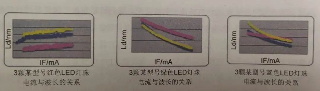 某型号 LED 灯珠电流与波长的关系如下图所示,这是在同一批次灯珠中红、绿、蓝色各取3颗灯珠,所测得的波长与电流的关系图。横轴是电流,纵轴是波长,即使不考虑 IC输出通道电流之间的差异,在电流大小相同的情况下,灯珠的波长也是不一样的。所以,在这两个先天原因的双重影响下,LED 显示屏就很容易出现花屏现象。