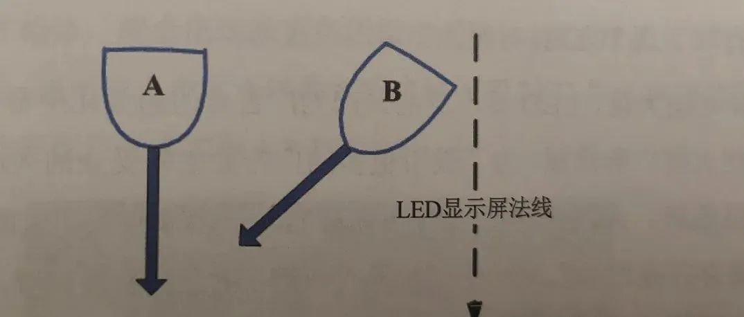 (1)、装配工艺。目前 LED 显示屏所用灯珠的装配方式多为直插式和表贴式灯珠安装法线与 LED 显示屏法线如图 下图 所示,在装配的过程中,很难保证每个灯珠的安装法线与LED显示屏法线完全一致,由此造成的光线不均匀是产生花屏的重要因素之一。同时,亮暗线也是装配工艺不佳的结果。