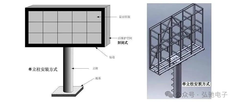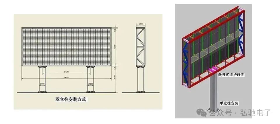 特点:单立柱(小屏)/ 双立柱(大屏),可选敞开式 / 封闭式维护通道