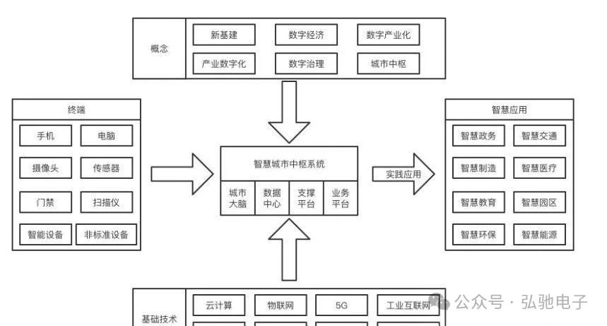 大家从上图可以看到,智慧城市是通过连接终端,应用信息化技术和网络,组建城市中枢系统,最终促进各领域效率提升和经济结构优化。
