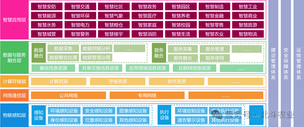 智慧城市的网络通讯技术(ICT)架构自下而上包含五层,依次为:物联感知层、网络通信层、计算存储层、数据与服务融合层、智慧应用层,除基础架构外,还包含建设管理体系、安全保障体系和运维管理体系。
