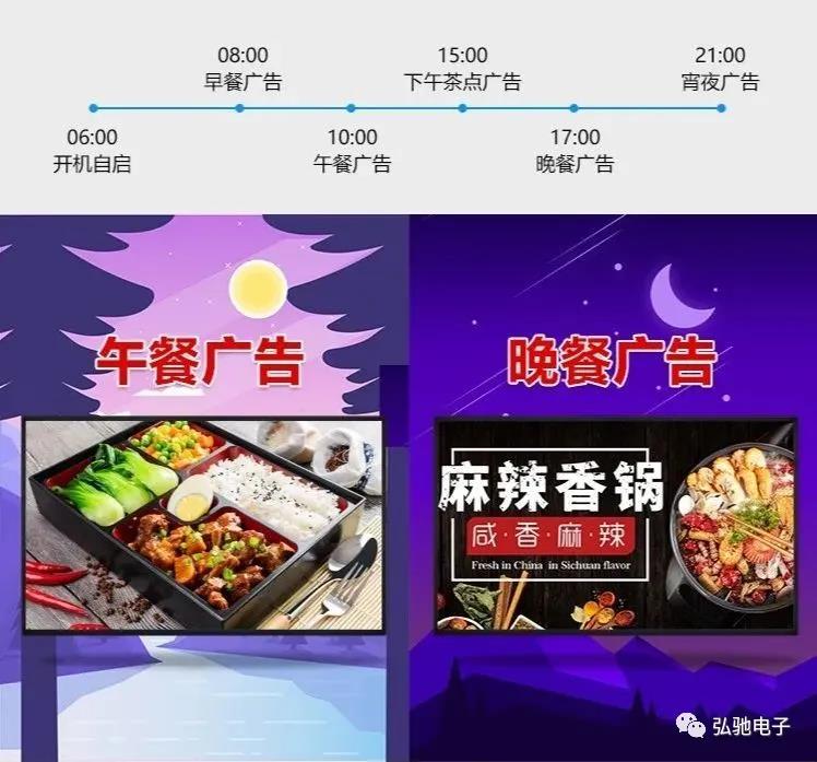 弘驰电子智能广告机是新一代的智能设备,通过终端软件控制、网络信息传输和多媒体终端显示构成一个完整的广告播控系统,并通过图片、文字、视频、小插件(天气、汇率等)等多媒体素材进行广告宣传。弘驰电子智能广告机最初的构想是将广告变被动为主动,所以广告机的互动性使得它具备很多公共服务功能,并以此来吸引顾客主动浏览广告。