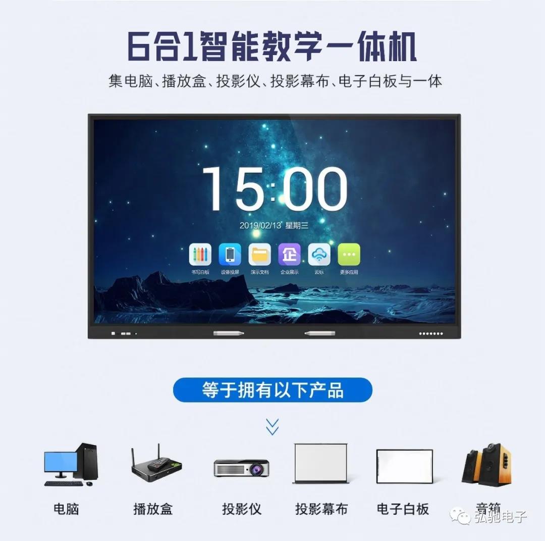 弘驰电子触控教学一体机是集电脑、音响、平板、幕布、投影、白板于一体机的电子设备,同时配备海量教学资源,以及多点红外触控技术,支持多人同屏互动,或一人多点互动。