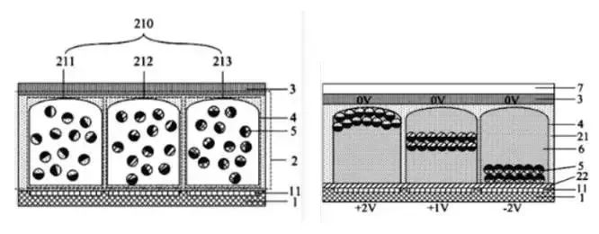 即光学上推动油墨的收缩,露出白色背板,外加电压大小决定了对应的静电力与毛细力的平衡位置,即实现了对显示灰度的控制,可通过油墨颜色调控来显示像素预期的色彩,从而获得多彩的显示效果,可显示彩色图像和视频。